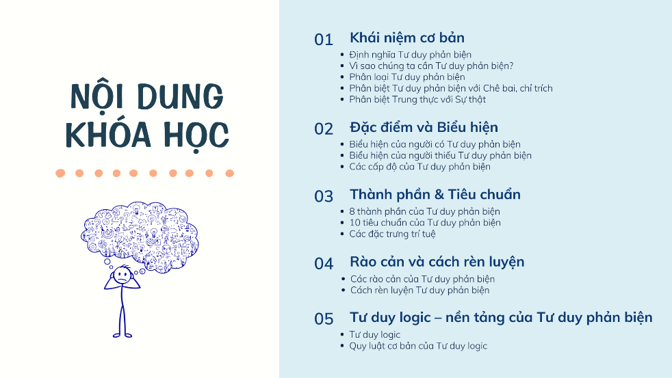 “Tư duy phản biện” thường dễ bị nhầm lẫn với “chê bai, chỉ trích”. Khóa học sẽ giúp làm rõ sự khác biệt này, đồng thời trang bị nền tảng tư duy phản biện một cách hệ thống: từ việc làm rõ các khái niệm cốt lõi, phân biệt những điểm dễ nhầm lẫn, đến việc hiểu và vận dụng các thành phần, tiêu chuẩn đánh giá tư duy. Trên cơ sở đó, học viên được rèn luyện kỹ năng tự điều chỉnh tư duy, phản biện trong các tình huống thực tế và xử lý hiệu quả những rào cản tâm lý - xã hội thường gặp trong môi trường làm việc.
